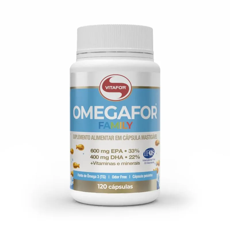 OMEGAFOR® FAMILY é um suplemento alimentar de óleo de peixe, fonte de Ômega 3. Seus principais derivados são o ácido eicosapentaenóico (EPA) e docosaexaenoico (DHA). Fonte de vitamina K, vitamina D, vitamina B12 e Selênio.